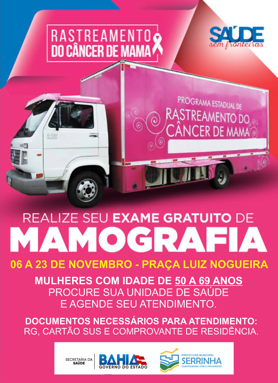 A prefeitura municipal de Serrinha informa que uma Unidade Móvel de rastreamento de câncer de mama se instalará em nosso município no período de 06 a 23 de novembro, na Praça Luiz Nogueira, em frente ao Coreto Municipal.